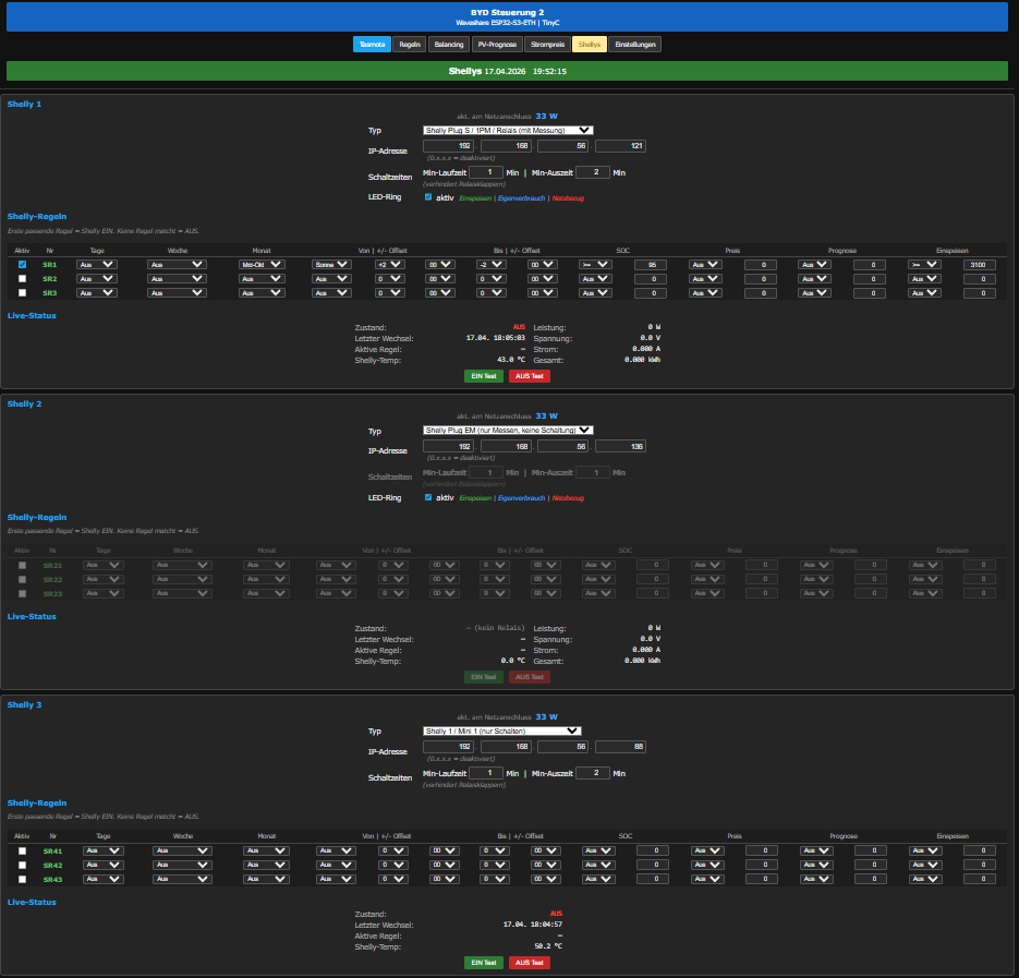 Up to N Shelly devices (Plug S 1PM, Plug EM, Mini relays …) are auto-discovered or manually configured by IP. Each device has its own rule list with the same combinators as the battery rules, so loads can be switched on PV surplus, cheap-grid windows, or SOC thresholds.