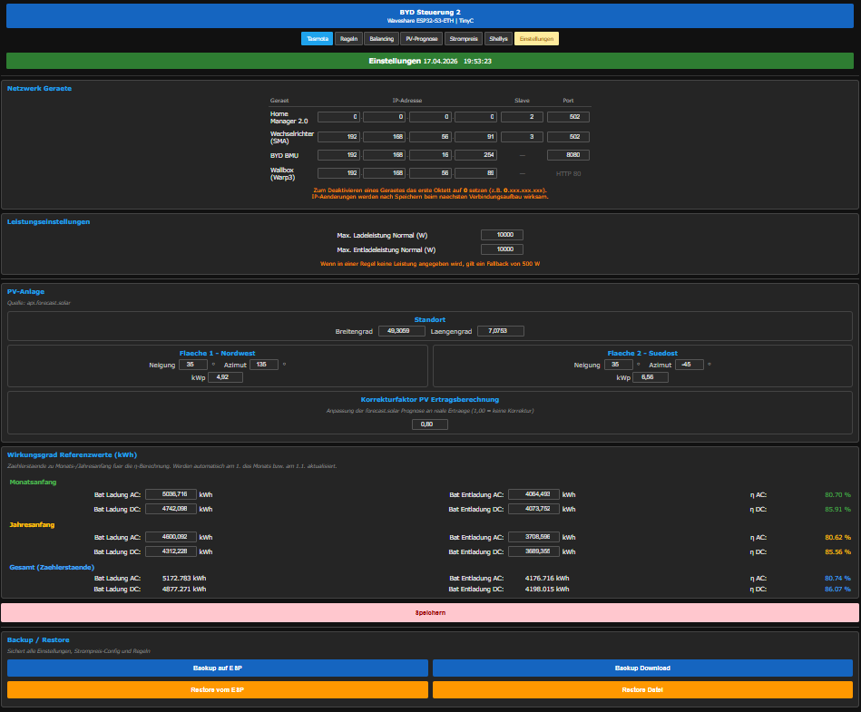 Hardware: Waveshare ESP32-S3-ETH · BYD HVS 10.24 battery · SMA Tripower 10.0 SE inverter · SMA Home Manager 2.0 · Wallbox Warp3 · Shelly switches.