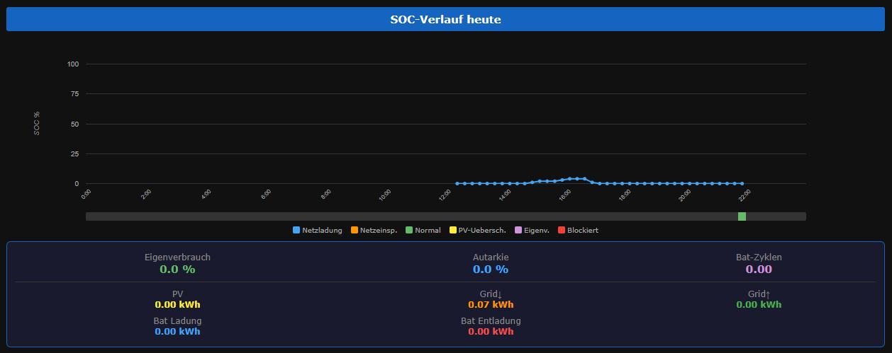 A rolling daily plot of the battery's state-of-charge with colour-coded operating modes (grid charge / grid feed-in / normal / PV surplus / own use / blocked). Below the chart: self-consumption ratio, autarky percentage, and battery cycle counter.
