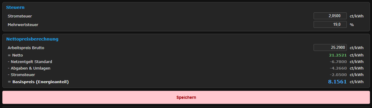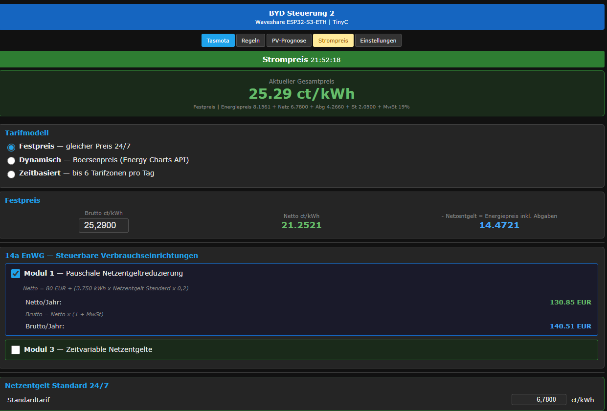 Three pricing models can be selected. The fixed-tariff calculator breaks down the consumer price into its regulatory components (Netzentgelt, Abgaben, Steuern) per the German 14a EnWG framework.
