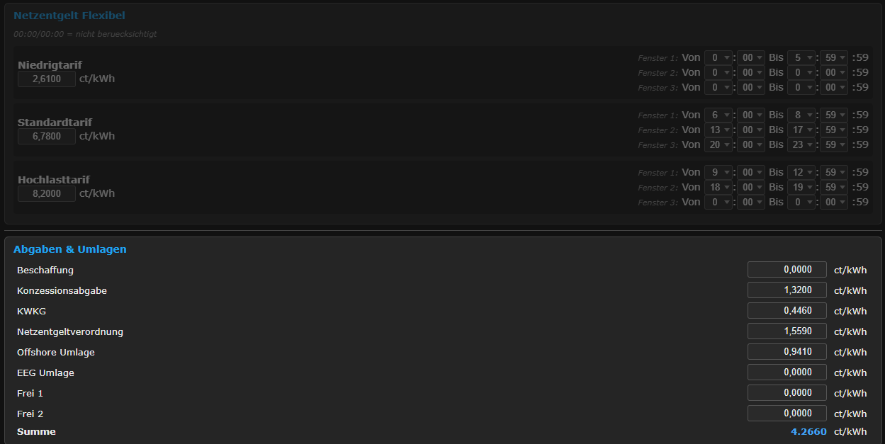 Per-window time-of-use tariffs with up to three windows for low / standard / high-load periods, and a fully editable list of grid surcharges and levies.
