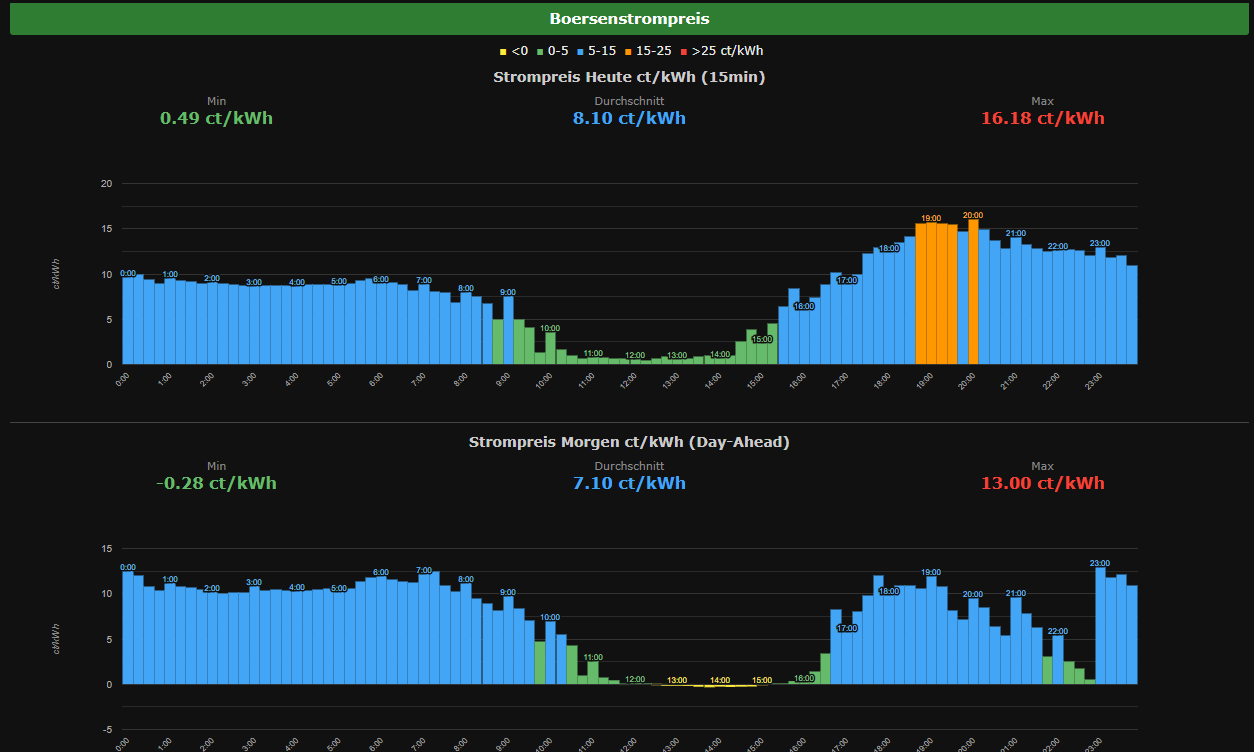 When the dynamic-price model is selected, the Boersenstrompreis page pulls the day-ahead spot price (EPEX) and visualises it as a coloured bar chart — green for cheap, orange for premium hours.