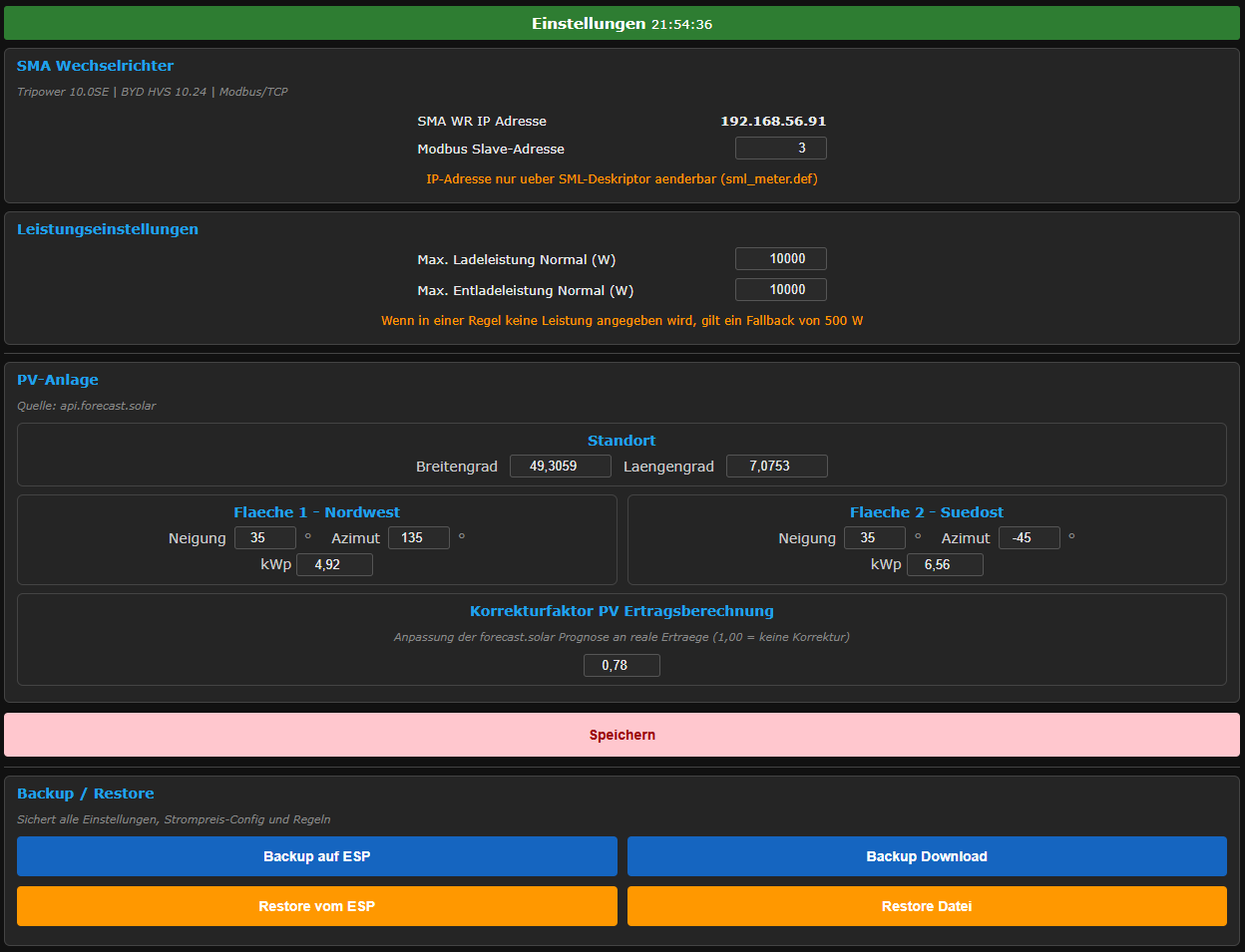 Modbus/TCP address of the SMA inverter, max charge/discharge power, plant location (lat / lon) and per-roof orientation (tilt + azimuth + kWp). A forecast correction factor calibrates the model to measured reality.